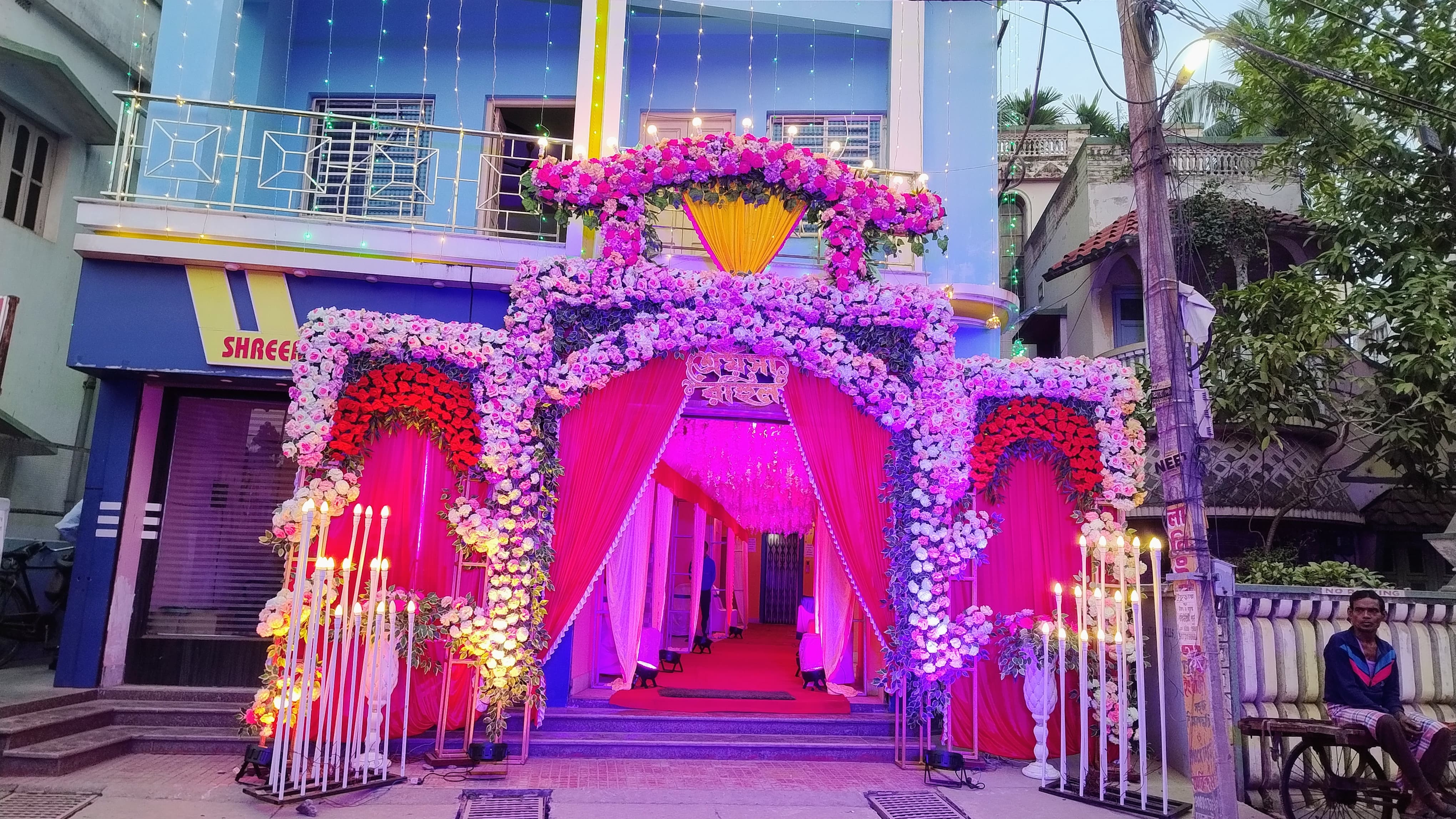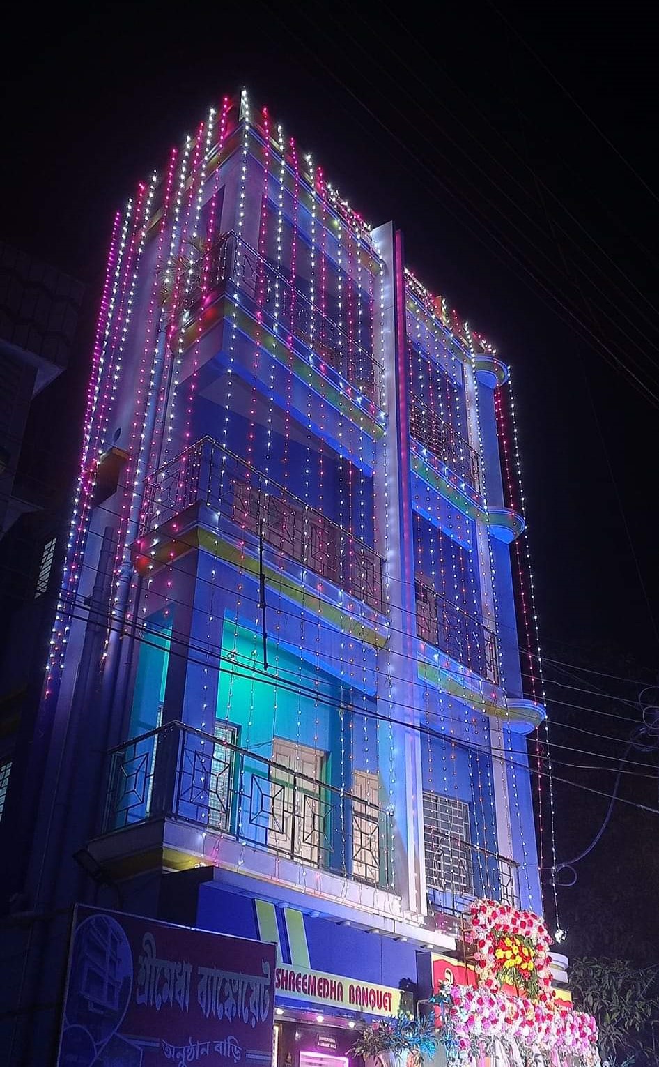 It has three floors, one for each event for a Bengali reception. The capacity of the hall is on the medium size. Location-wise, it is well within a short distance from most of the important places surrounding Chinsurah and Chandannagar. Neat and clean.